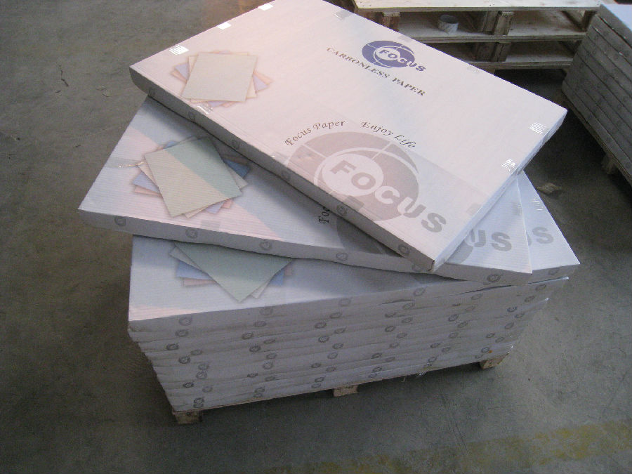 无碳复写纸Brief info of carbonless paper无碳复写纸简介 无碳复写纸(Carbonless Copy Paper, 简称CCP)是一种新颖的复写纸,其特点是,在复写纸的上层写字,不用垫涂了油墨的复写层也能复写。 无碳复写纸是一种隐色复写纸,具有直接复写,直接显色的功能。它的显色主要是:在外力作用下,使微胶囊中的力敏色素和油溶液溢出与显色剂接触后发生染色反应,从而起到复写的作用。主要用于多联表格、票据、连续财票、一般业务财票等。FOCUS brand carbonless paper sheet 平板Main characters of FOCUS brand carbonless paper:1. Raw material: 100% virgin wood pulp2. Image (print): Black & blue3. Tinted: white, pink, yellow, blue, green4. Substance: 50gsm – 170gsm, normally clients need CB/CFB/CF 55/50/55gsm5. Size: 61x86, 70x100, 65x100, 69x89 or per request6. Packaging: 500 sheets/carton, 24-27cartons/pallet, stacked on pallets.主要特征:1. 原材料:100%纯木浆2. 显色:黑显和蓝显3. 颜色:白,粉,黄,蓝,绿4. 常规克重:CB/CFB/CF 55/50/55gsm5. 尺寸:61x86, 70x100, 65x100, 69x89等6. 包装:500张/令平板照片FOCUS brand carbonless paper roll 卷筒1. Raw material: 100% virgin wood pulp2. Image (print): Black & blue3. Tinted: white, green, pink, yellow, blue4. Substance: 50gsm – 170gsm, normally clients need CB/CFB/CF 55/50/55gsm5. Size: Width (mm): 241, 305, 431, 457, 600 or per request, length 6000m – 12000m.6. Packaging: thin film, sponge & corrugated paper, stacked on pallets.主要特征:1. 原材料:100%纯木浆2. 显色:黑显和蓝显3. 颜色:白,粉,黄,蓝,绿4. 常规克重:CB/CFB/CF 55/50/55gsm5. 尺寸:宽幅241mm, 305mm, 431mm, 457mm, 600mm, 长度6000-12000m等卷筒照片